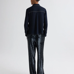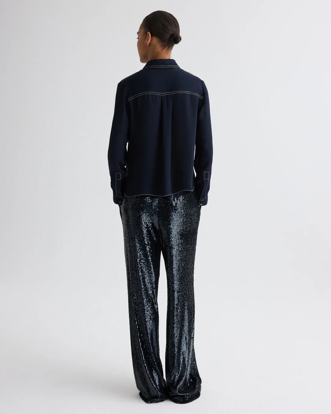Cropped button-up work shirt in silk georgette. Fabric is a medium-weight stretch silk georgette with a smooth, drapey hand, piece-dyed into rich midnight. The New Carter features a boxy fit and is finished with white contrast stitching, a button-up placket, chest flap pockets, exposed yoke, and button cuffs.