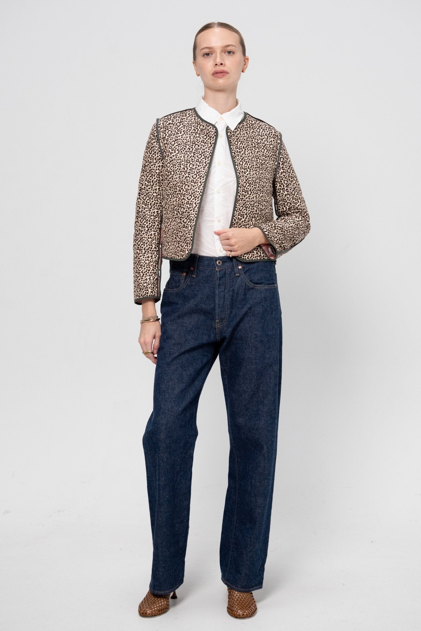 The Cats & Tigers Jacket by Odeeh is a short quilted jacket featuring an inner lining in leopard print fabric, a rounded neckline with an open front, and contrast piping at the edges.