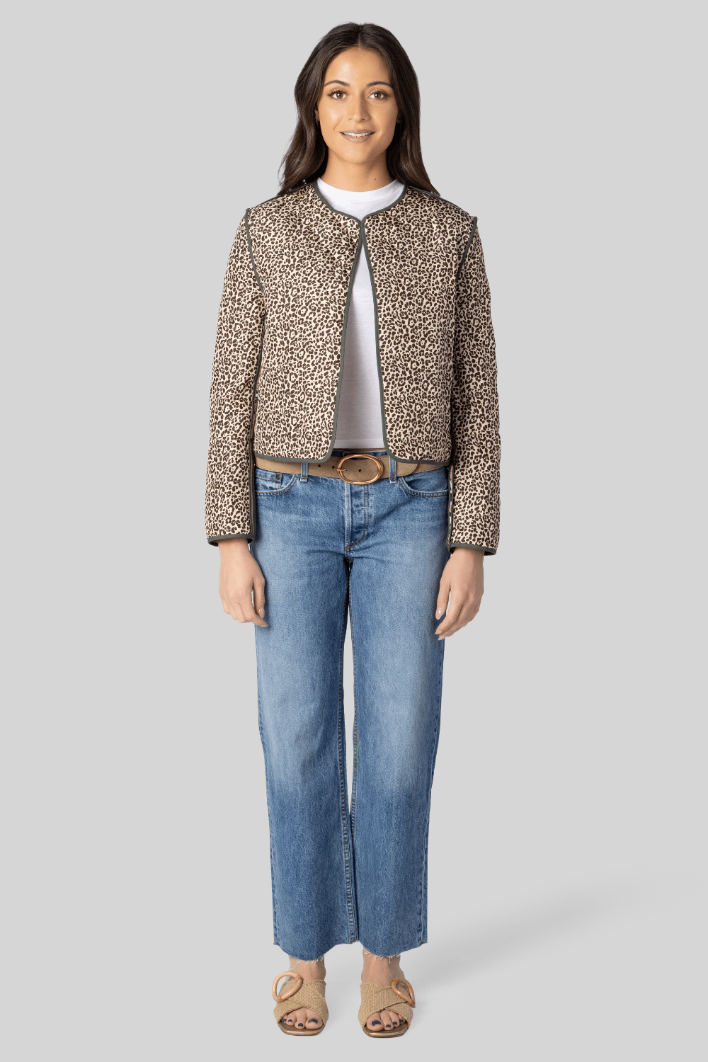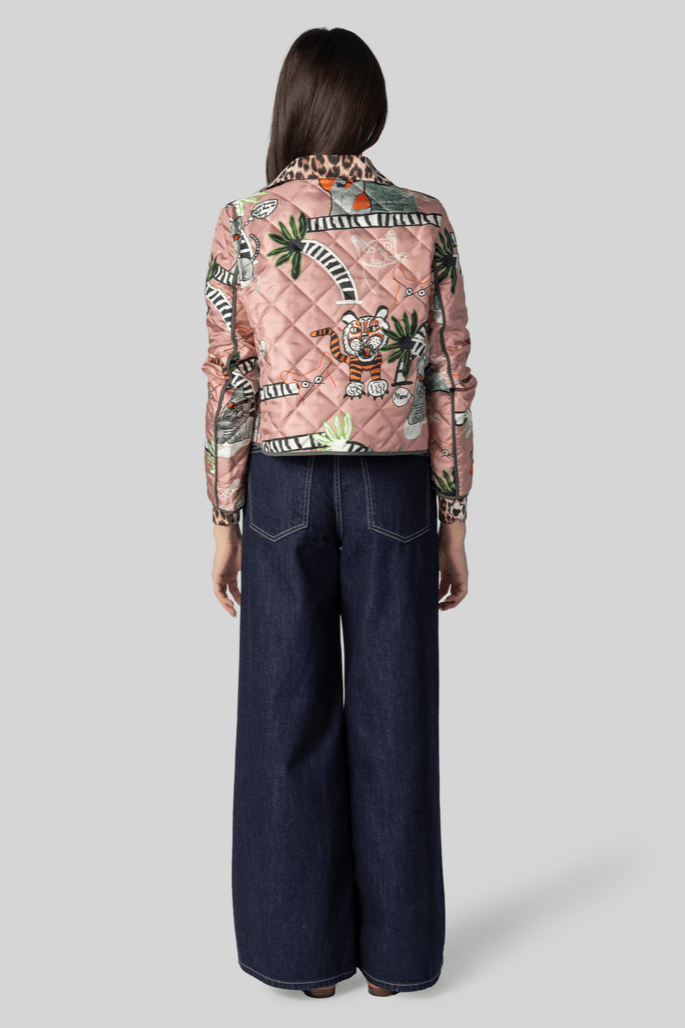 The Cats & Tigers Jacket by Odeeh is a short quilted jacket featuring an inner lining in leopard print fabric, a rounded neckline with an open front, and contrast piping at the edges. The jacket is reversible!