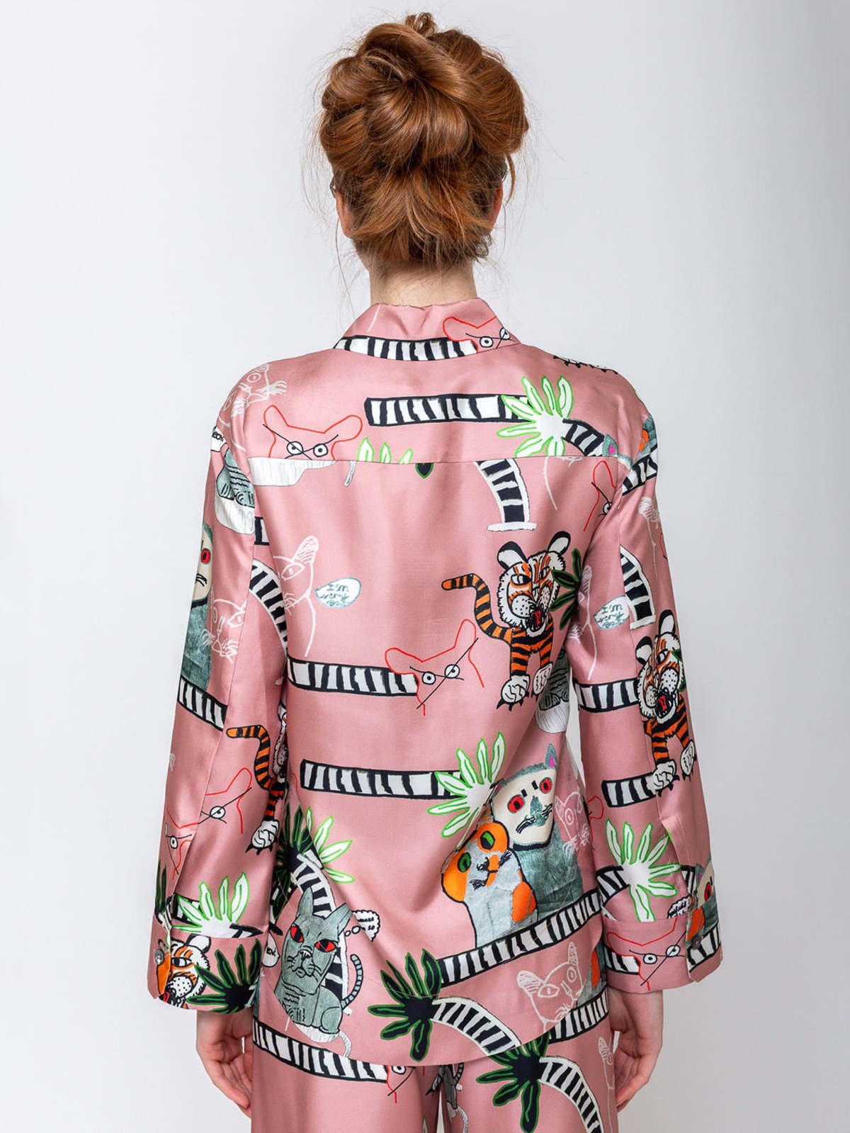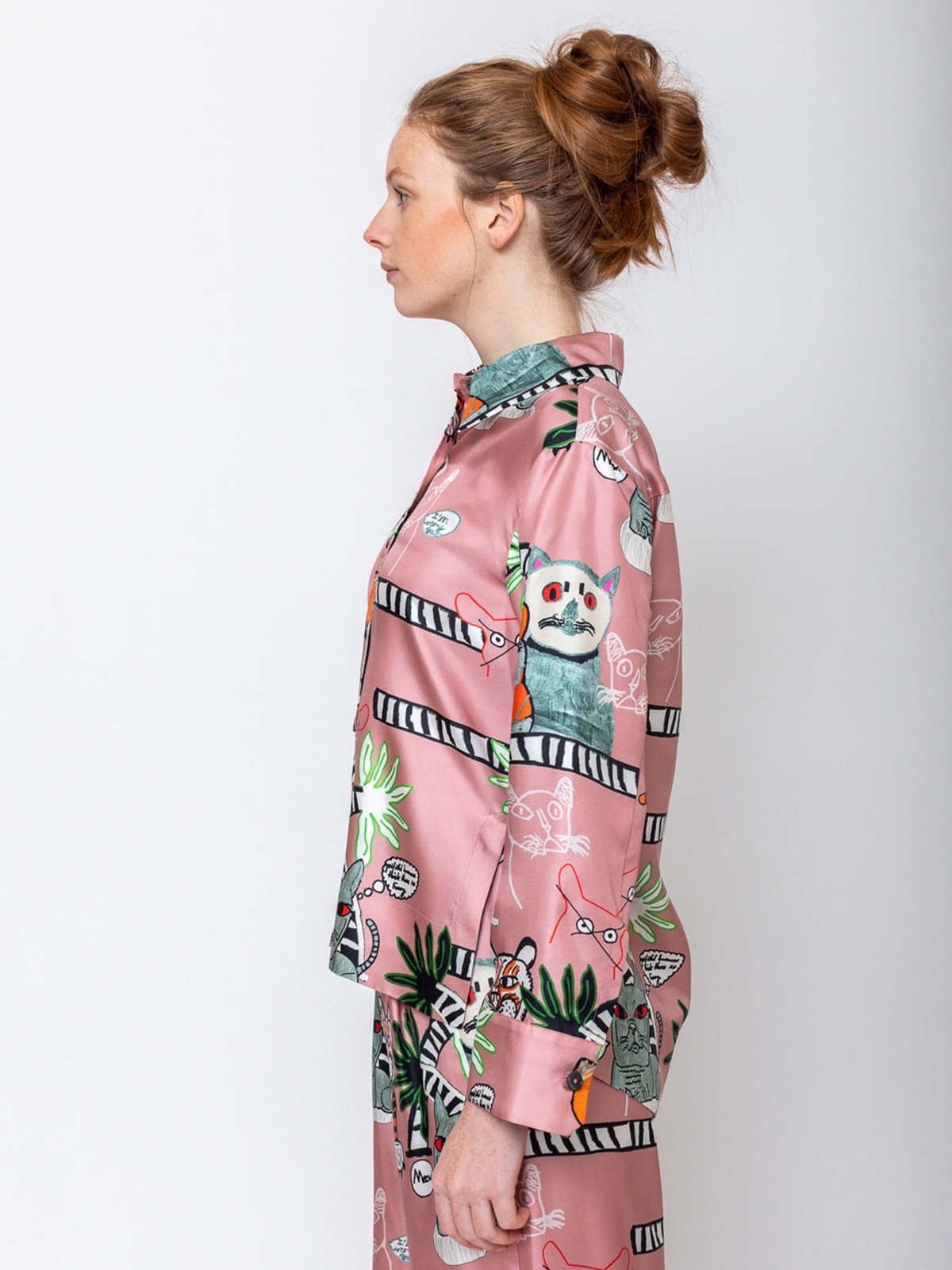 Elevate your wardrobe with this sophisticated silk blouse from Odeeh, featuring an artistic cats and tigers print in soft blush tones. Crafted from luxurious silk, this long-sleeve button-down shirt combines timeless elegance with contemporary design. We love the top paired with the matching pants.