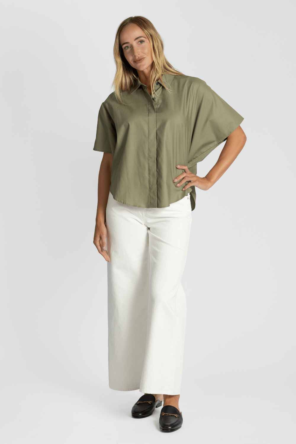 Crisp cotton broadcloth short-sleeved shirt with folded collar, draped circle silhouette and curved hem with side slits. Pair with the matching Aissa pant.