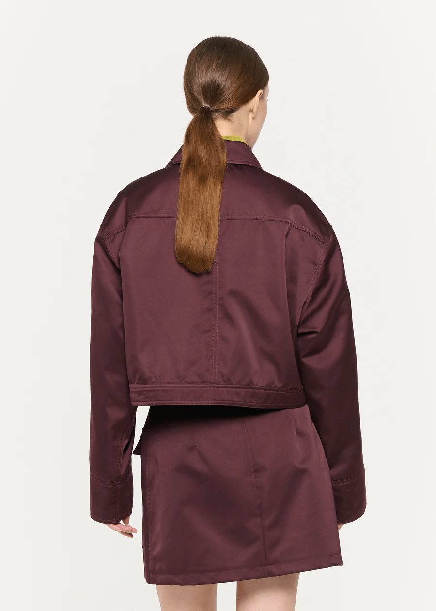 Burgundy jacket in duchesse, a satin fabric with a rich and dense hand. Front buttoned, one flap pocket and one flat pocket.