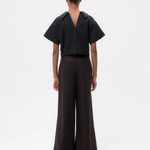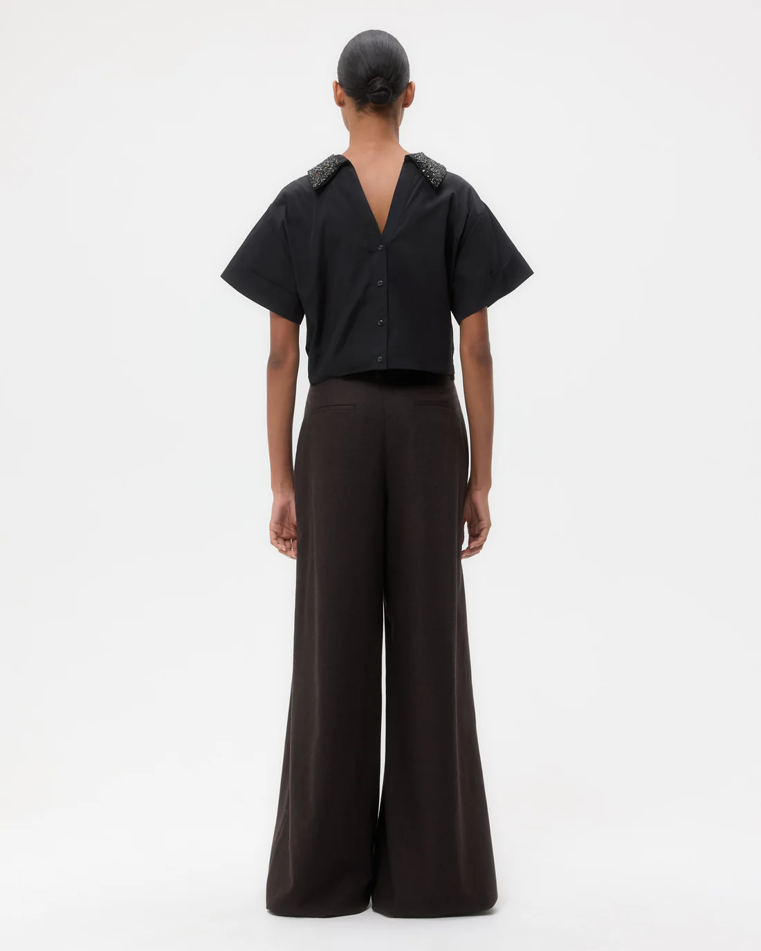 Cropped, reversible shirt in cotton poplin embellished with a sparkling prong-set crystal collar. Fabric is more structured poplin with a smooth texture and crisp hand feel. The Forever and Always shirt has a relaxed fit. Complete with a wide neckline, open back with button closure, and the option to wear cinched at the waist or loose as a cropped button-down.