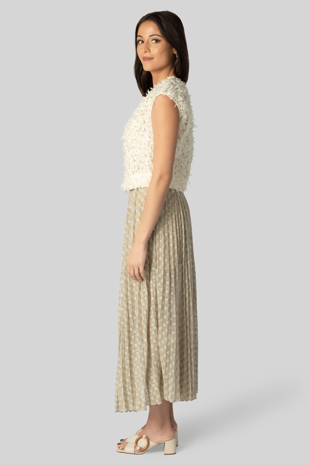 This sleeveless top by Odeeh is all about the fringy tape detail. Offering a slightly flared bottom and sheer enough to add a bit of allure without the need for a cami, this top can be dressed up or down for any occasion. The back also offers a chic and feminine touch with small buttons going down the center.