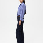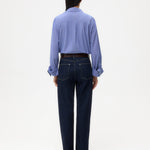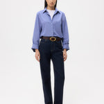 Dark-wash, high-rise, straight-leg jeans in authentic washed heavy denim. Relaxed at the hip and through the leg. Complete with five-pocket styling, custom metal rivets, zip-fly, belt loops, metal shank, and contrast stitching at the seams.