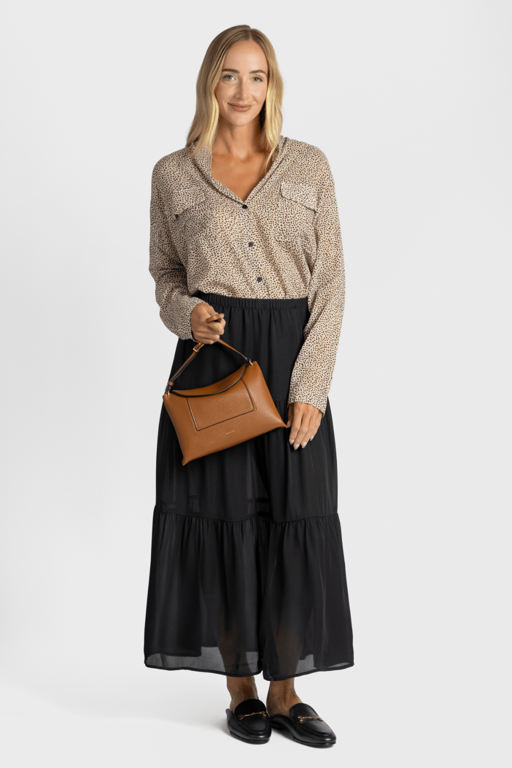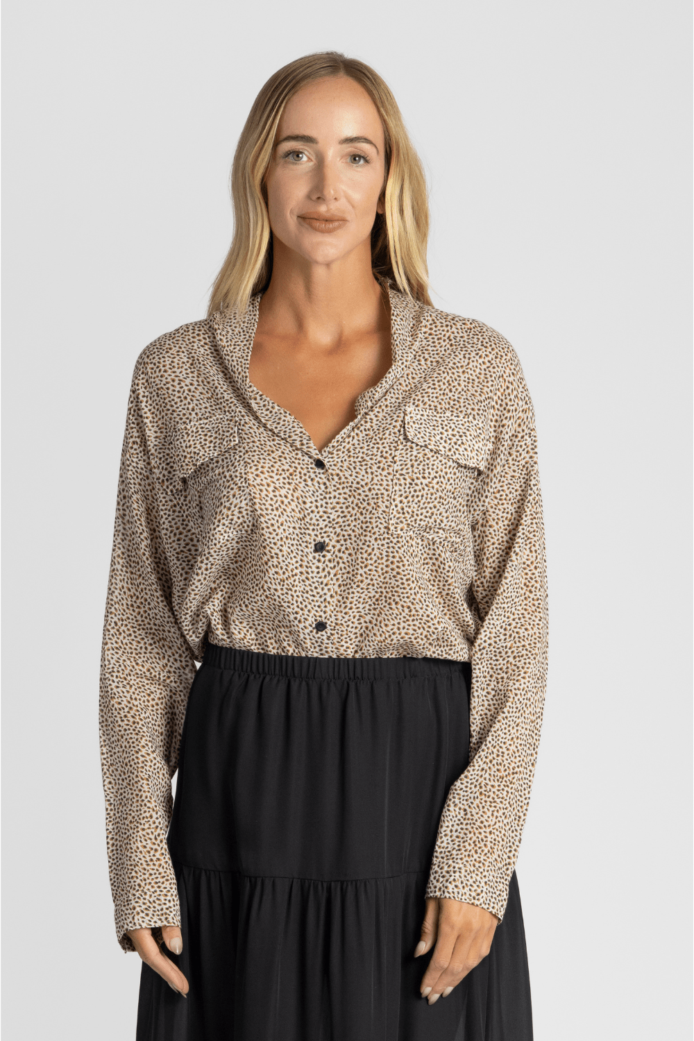This collarless shirt from Forte Forte features long sleeves, a button fastening, and patch pockets. The shirt is designed with a spotted pattern. We love it styled with the SPRWMN black skirt.