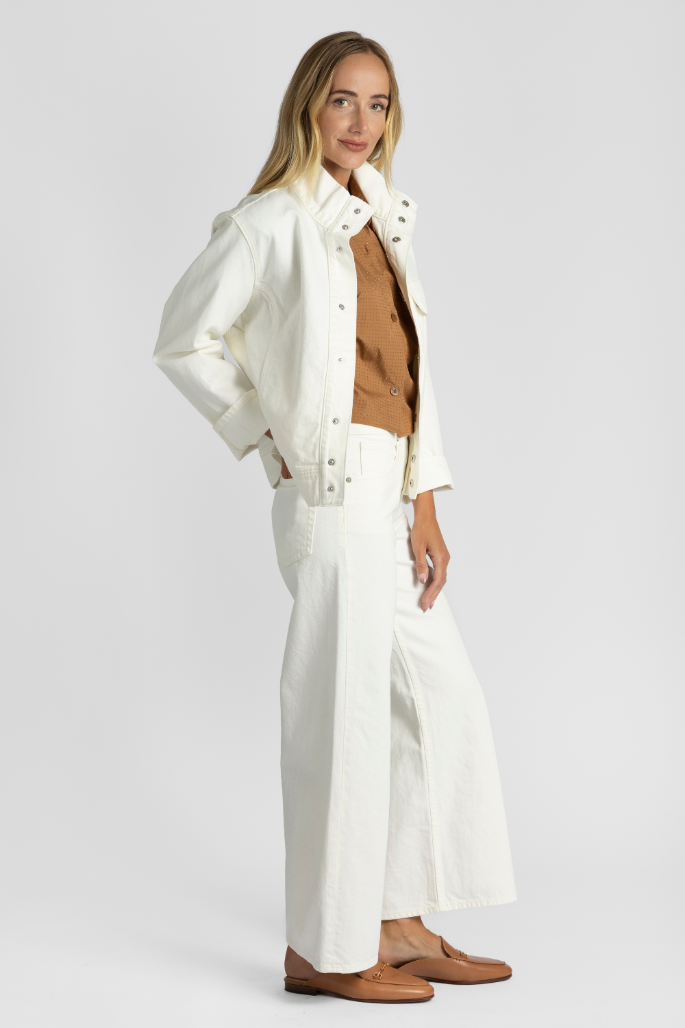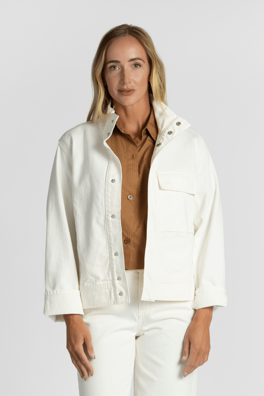 This distinctive denim jacket has a boxy, relaxed fit. Details include a stand collar, hidden snaps at the placket, and an oversize flap pocket at the chest. Wear it with anything, a wardrobe must have! Wear with denim, pants or over a dress.