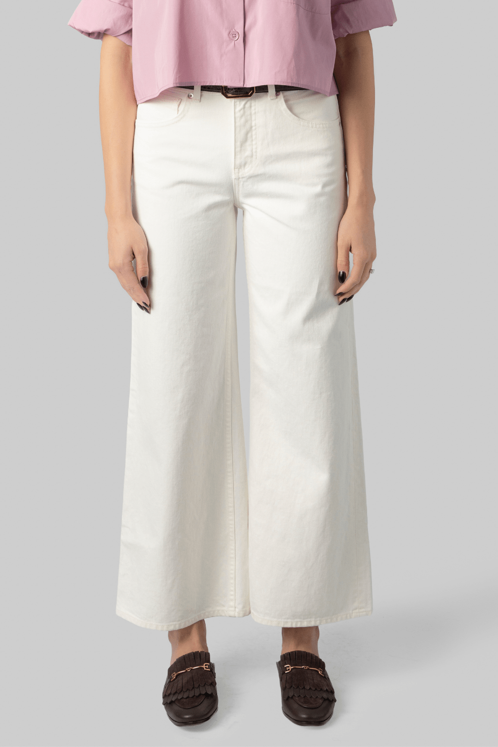Mid-rise cropped wide leg jean in Japanese non-stretch denim. Fitted through waist and hips. Cropped ankle length. Five pocket details. Zip fly. Shank closure. Side seam. Belt loops.