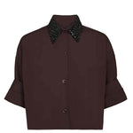 Our signature cropped shirt in cotton shirting embellished with a collar of hand stacked prong set crystals. This fabric is denser than our superfine cotton, allowing for a crisp structure and a heavier hand. The Next Ex is a cropped, short sleeved shirt. Complete with a chest patch pocket, button up placket, spread collar, and our signature double roll button cuffs.