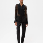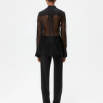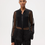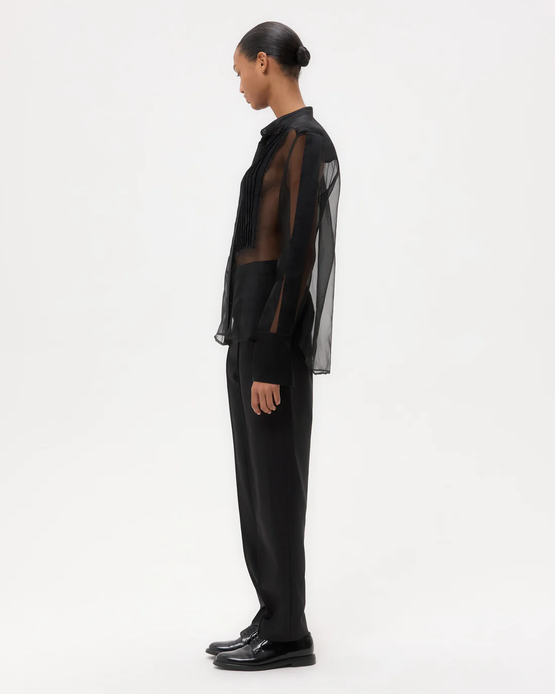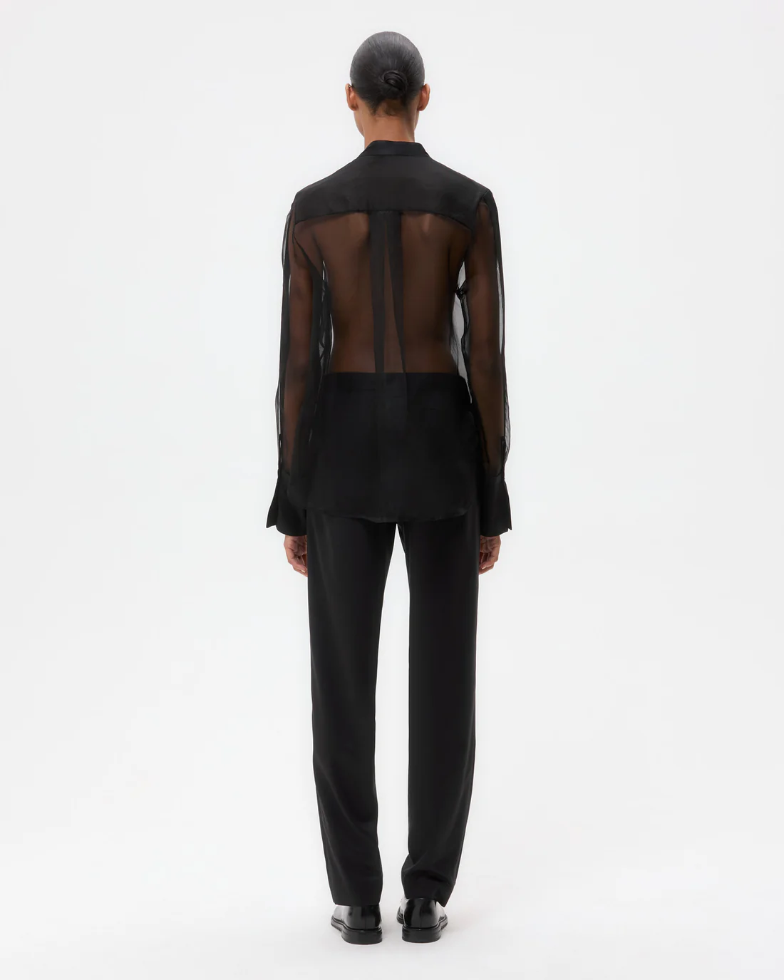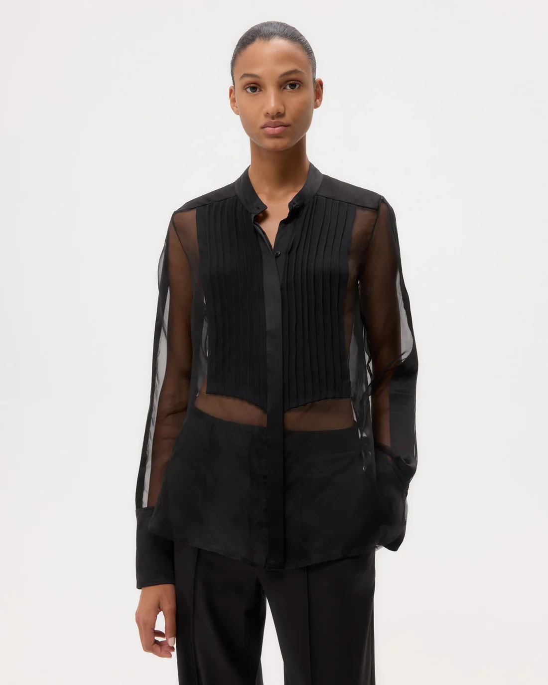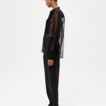 Oversized sheer shirt in silk organza. The Peyton features a long, relaxed fit with a tuxedo-style paneled construction. Complete with a deep chest patch pocket, exposed button-up placket, shirttail hem, and distinctive double-layered French cuffs.