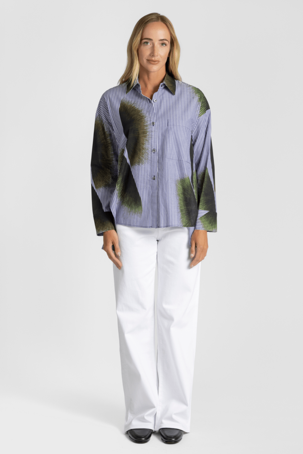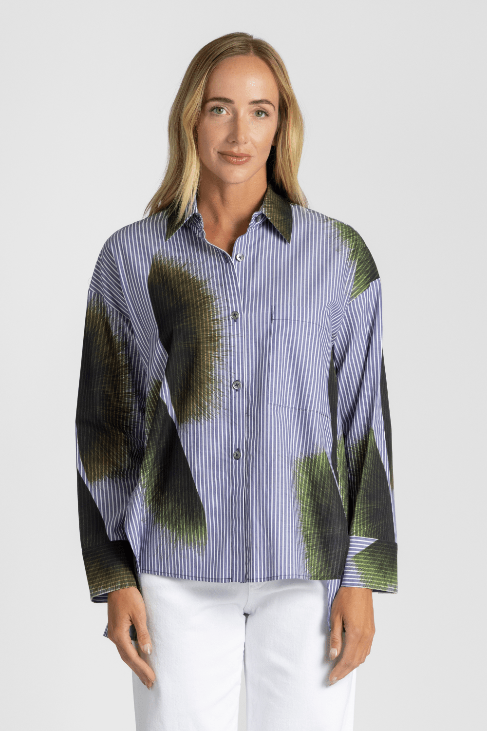 Odeeh's striped top has overlayed patterns of greens and brown throughout the top. Pairs great with denim, brown or green leather pants.