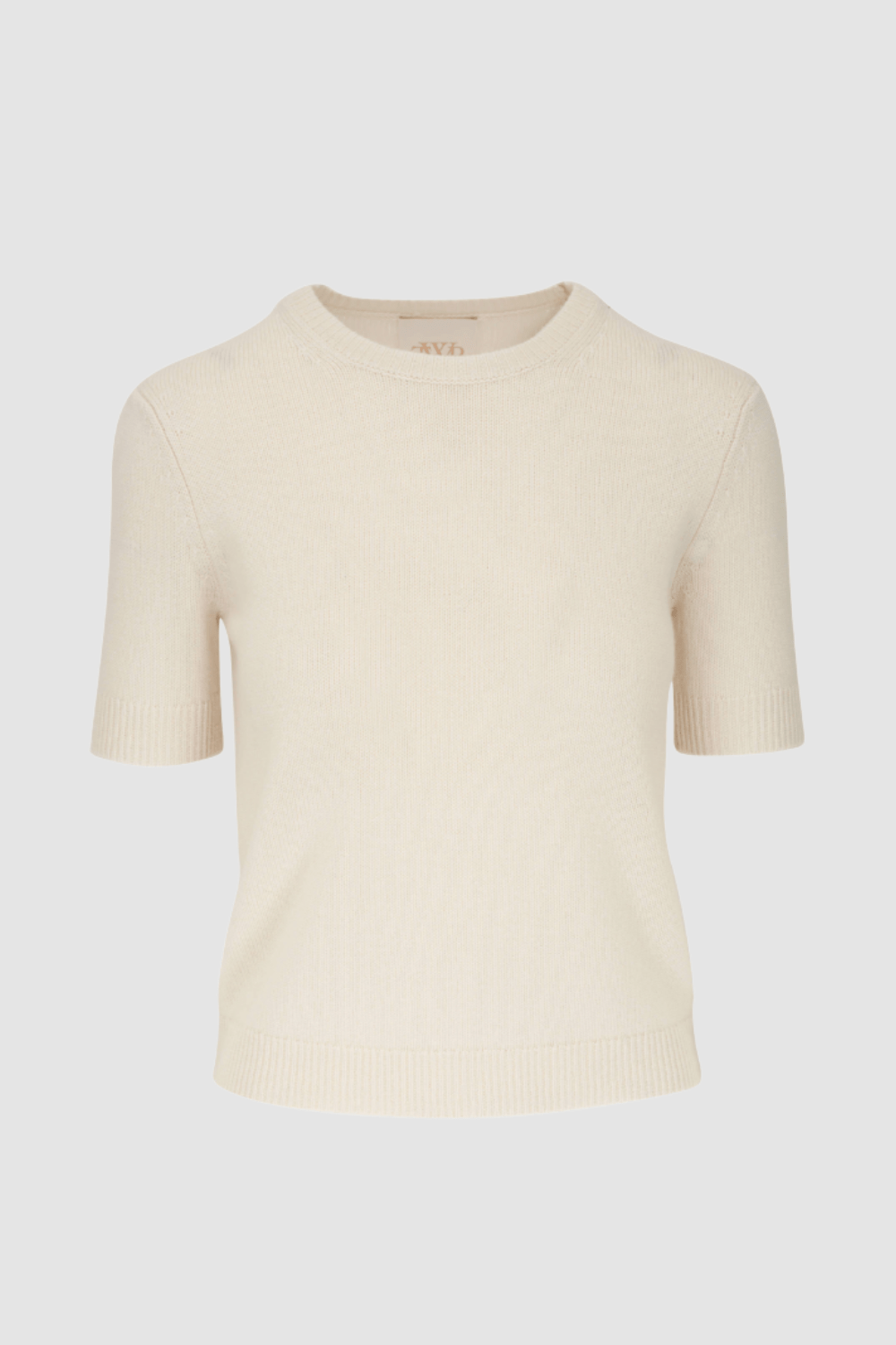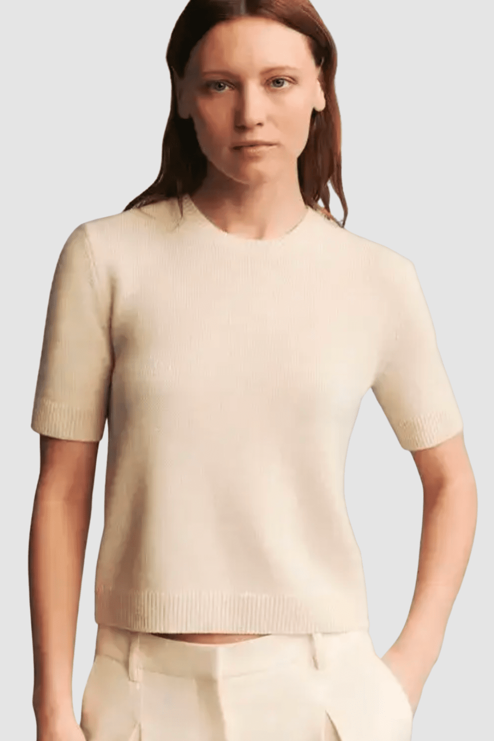The short sleeve Audrey Sweater you'll want in every color. Elevate your wardrobe with this short sleeve crew neck by TWP, perfect embracing minimalist trends. The garment sits comfortably at the hips with a pull-on closure and a relaxed body fit, complete with ribbed finishes at the collar, cuffs, and hem.