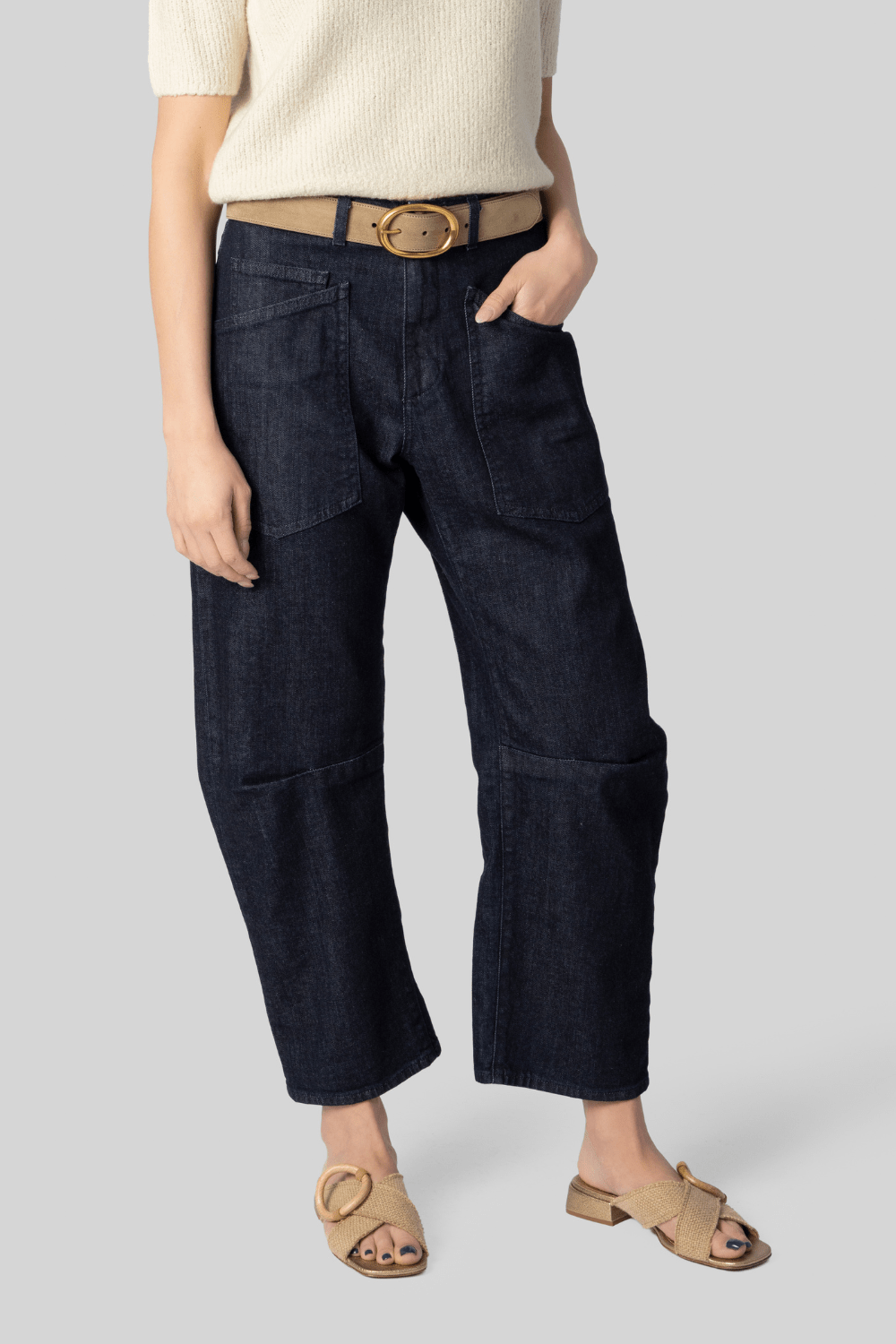 Mid-rise, relaxed fit barrel leg jean in Japanese stretch denim. Uniquely curved silhouette. Seam detail at knees. Gusset at inseam. Zip fly. Shank closure. Top-stitched front and back patch pockets. Belt loops.