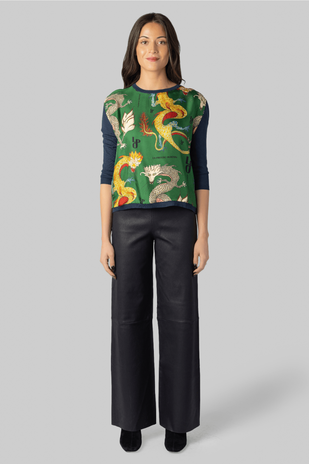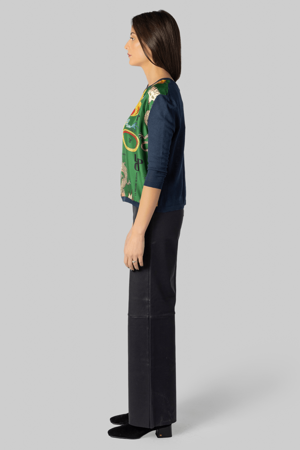 Perfect year round top. Lightweight, ultra fine merino wool, 3/4 sleeves and back of pullover, the front is silk twill. Vibrant colors make this top extremely versatile with everything in your wardrobe.