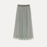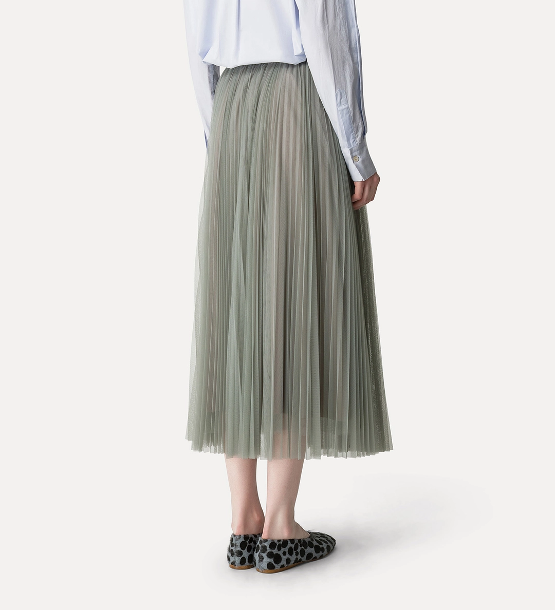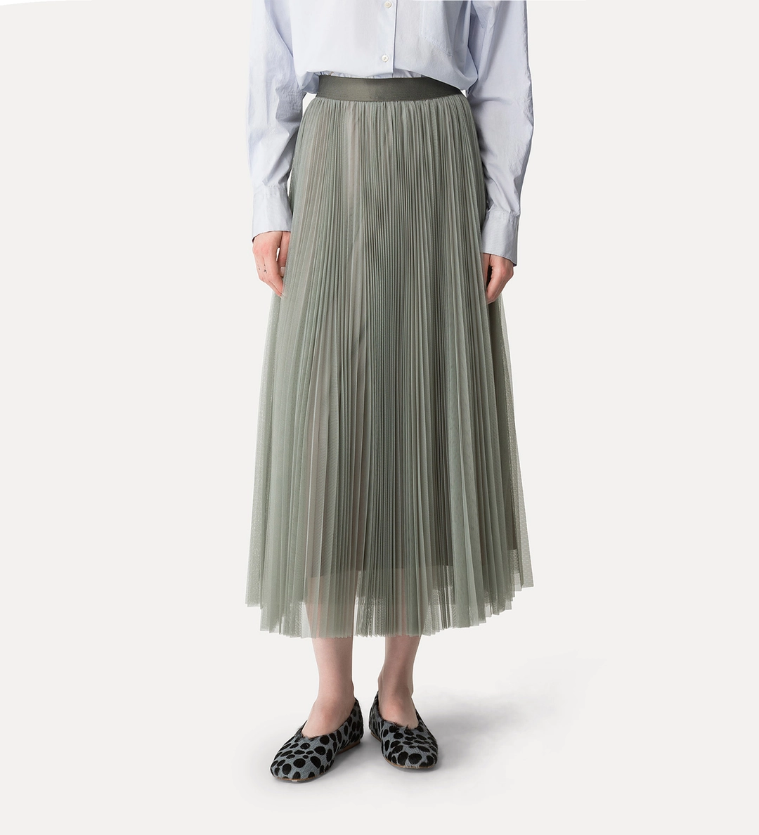 Diaphanous delicacy and gentle feminine flair are the defining characteristics of the tulle skirt with sunray pleating doused in the subtle shades of the season. Completed with an elasticated waistband, it has a double fabric layer and lined interior that create a romantic swishy swirl.